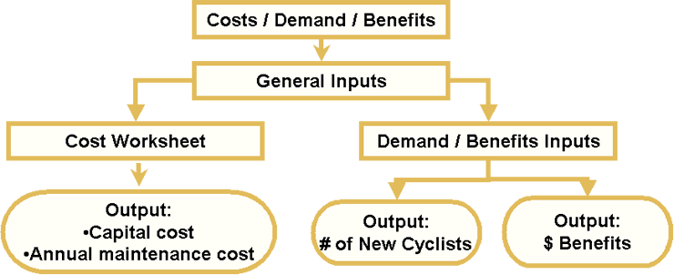 This tool provides guidelines for making bicycle facility investment decisions. The first step of the application tool asks if you want to calculate costs, demands, or benefits. You can choose all three if you wish. You will then will be presented with a “tree” of questions regarding the type of facility you are considering as well as information about your geographic area. The guidelines follow this general outline: