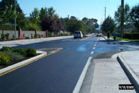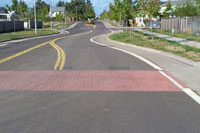 The most unusual and controversial design feature is the use of raised bicycle lanes. City staff knew of this technique being used in Europe, and after a great deal of internal discussion, decided to use this feature on Ayres Road. The primary reason for using raised bicycle lanes instead of the conventional on-street lane at normal street grade was the desire to provide a very strong, visible, right-hand edge to the vehicle travel lanes. Eugene’s experience on many other streets has been that on-street bike lanes tend to be seen as another 1.5 to 1.8 m (5 to 6 ft) of pavement on each side of the road. Even though most motorists don’t physically occupy this space when driving along tangent sections, most use it when they create their own transitions on curved road segments.