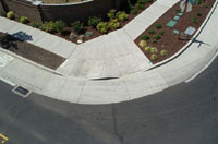 When it was decided that a raised bike lane would be a design feature for the Ayres Road improvement project, several design issues became apparent right away: how wide and elevated should the riding surface be, how wide and at what slope should the beveled edge or transition surface be, what type of material should it be constructed of, and how should transitions at accessible ramps and intersections be designed. The only information on raised bike lanes available at the time came from the Oregon Bicycle and Pedestrian Plan, which was limited to a photo of one constructed in Switzerland and a cross-section sketch showing how the raised bike lane separates bicyclists from motorists and bicyclists from pedestrians. No details or dimensions were specified in the plan. The photo as well as the sketch depicted a raised bike lane constructed of asphalt concrete, the same material used in the motor vehicle travel lane, with a sloping concrete ribbon separating the two. The city’s desire was to have at least 1.4 m (4.5 ft) of bicycle-riding surface, the same accommodated by a wide curb-and-gutter option that is used as a bike lane. It was also decided that the raised bike lane would be constructed of concrete because a narrow lane of asphalt concrete would be hard to construct and to maintain. The design of the beveled edge determined how high the raised bike lane would be, and it was based on how well it would deter casual intrusion by motorists but still be traversable by motorists and bicyclists alike. Designers chose to use a 4:1 beveled edge with a transition width of 30.5 cm (1 ft) (a 7.6 cm (3 in ) rise in a 1 ft run). The treatment at intersections became a challenge also. At one intersection, the raised bike lane continues around the curb return, which brought up accessibility requirements. At this location, it was decided to transition the beveled edge near the curb return from a 4:1 slope to a straight grade all the way to the bottom of curb. This choice complies with accessibility guidelines and seems to satisfy riding conditions as well.
