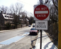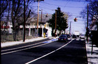 One block of this one-way street was striped as a contra-flow lane to allow cyclists to avoid an arterial street without shoulders or bike lanes and with large traffic volumes, including trucks. A sign with a graphic representation of the contraflow lane was installed at the intersection entering the street. Blue thermoplastic was added to each end of the lane to call attention to its presence. Traffic volumes are below 2,000 vehicles per day.