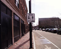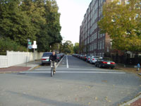 Sewer construction and roadway paving on this street offered the possibility of implementing traffic calming and other changes. Scott Street offers a direct connection between a minor arterial that is one of the area’s most used bicycle travel corridors and Harvard University, Harvard Square, and other destinations. It is a wide one-way street with little-used parking on both sides. A contraflow bike lane was marked and blue thermoplastic included to remind motorists to look for cyclists and not to drive in the bicycle lane. A sign was included, stating “Do Not Enter Except for Bicycles.” Traffic volumes are less than 2,000 vehicles per day.