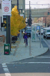 Bicyclists travel behind the transit stop platform to reduce potential conflicts with stopped streetcars and passengers.