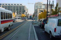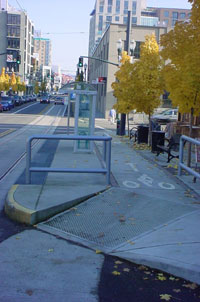 The introduction of a streetcar line on NW Lovejoy presented a difficult problem for maintaining bicycle facilities on the street. (Bicycles are not allowed on streetcars.) A streetcar platform at the intersection of Lovejoy and 13th extends to the edge of the travel lane. The streetcar tracks run parallel to the platform and 45.7 cm (18 in) from the curb face. Through cyclists were faced with the potential of a dropped bike lane and 45.7 cm (18 in) of clearance between the parallel tracks and an 27.9 cm (11 in) curb exposure. One consideration was to drop the bicycle lane and implement an out-of direction detour that involved an uncontrolled left-turn onto a busy arterial without bicycle facilities.