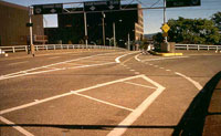Figure 1. Hawthorne bridge conflict area. Motorists exit right to an off-ramp, crossing the through bike lane that weaves left to cross the bridge. Example of a group 1 configuration.