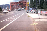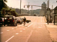 Figure 3. Bicyclists approaching the Broadway Bridge travel straight, while motorists from Interstate Avenue entering Broadway cross the bike lane conflict area (outlined by the dashed striping). (Group 3 site)