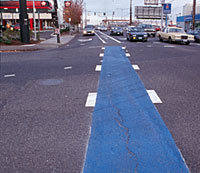 These results suggest that colored bike lanes and accompanying signs may be one way to heighten both motorist and bicyclist awareness of some types of intersection and merge conflict areas, thereby creating a safer riding environment. Motorist yielding behavior increased overall and at six of 10 individual sites. Slowing by bicyclists approaching the conflict areas also decreased, signaling an increased comfort level among cyclists. Some of the treated areas still are in good condition, even five years after the thermoplastic markings were installed. Some are somewhat worn, but still functional. Others are greatly worn where traffic is heavy. The thermoplastic coloring seems to last two to three years in places with heavy traffic. Five years following installation, Portland’s bicycle coordinator still has a high opinion of the value of the blue pavement markings. He has more sites identified for implementing this treatment when funds become available to install and maintain them.