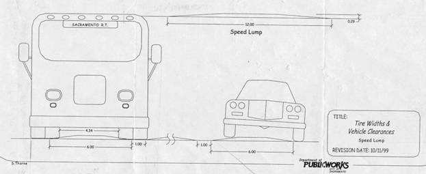 In researching the topic, staff found speed cushions in use in the United Kingdom as early as 1993 and learned of American experience in the cities of Sacramento, CA, and Austin, TX. Sacramento’s experience with what they refer to as a “speed lump” was particularly important because these devices are designed for the same size of fire engine and commercial bus as used in Vancouver. Figure 2 illustrates the trial speed lump from Sacramento.