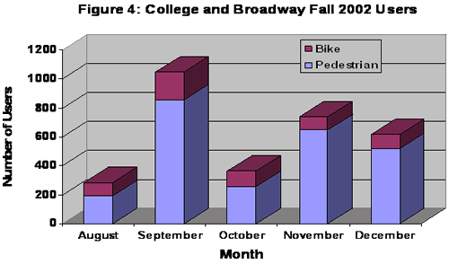 As mentioned above, several methods are employed to evaluate underpass use and benefit. User counts are performed at several locations throughout the city including the Broadway and College underpass. Although counts are not available for dates prior to construction, current counts indicate a high number of users. If the underpass did not exist, current users would be forced to cross Broadway at grade (figure 4). Counts at Broadway and College are taken once a month from 4:45pm to 5:30pm.