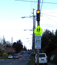 The general perception in Seattle was that 20 mph school zones are often not obeyed. The Seattle Department of Transportation (SDOT) Pedestrian Program receives a number of complaints from motorists each year asking for clarification of the sign used to qualify 20-mph speed zones. Quite often, the motorist has just received a speeding ticket and is not clear on precisely when the reduced speed limit is in effect. In general, speed zones in Seattle do not receive the respect that parents and school administrators would like to see. The speed at which a motorist travels has a direct effect on the injury sustained by the pedestrian in a collision, and can also increase driver compliance in stopping for pedestrians at crosswalks. A new school zone sign that reads “When Lights are Flashing or When Children are Present” and flashing beacon (figure 2) will replace the sign reading “When Children are Present” and will be set to flash during the times of the day that children are most likely to be traveling to and from school.