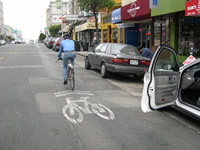 Based on previously recorded observations which showed that car doors open to about 2.9 m (9 ft, 6 in) from the curb face, the markings were placed 11 feet from the curb, giving cyclists with 0.6 m (2 ft) wide handlebars approximately 15.2 cm (6 in) of clearance from opened doors.