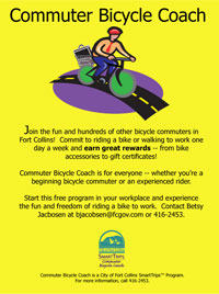 Commuter Bicycle Coach is an intensive bicycle commuter recruiting program that provides support, education and incentives to beginning and existing commuters. Developed and implemented in 2002, Commuter Coach presents cycling as a fun and easy way to commute to work. Bicycle commuting provides the freedom and individuality we enjoy, while easing traffic congestion and improving air quality.