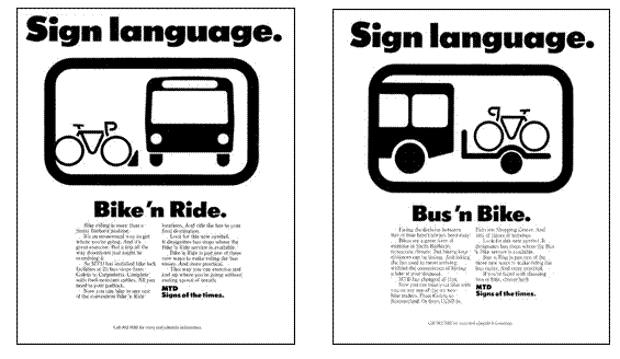 With the continued growth of the bicycle trailer program and the opening of MTD’s new Park & Ride Facility in Goleta, which included new bicycle lockers, MTD embarked upon a large multi-media campaign centered on familiarizing the public with the bike and ride program. The campaign, “Signs of the Times,” included print, radio and bus advertising and bus stop signs promoting the Bike ‘n Ride and Bus ‘n Bike programs.