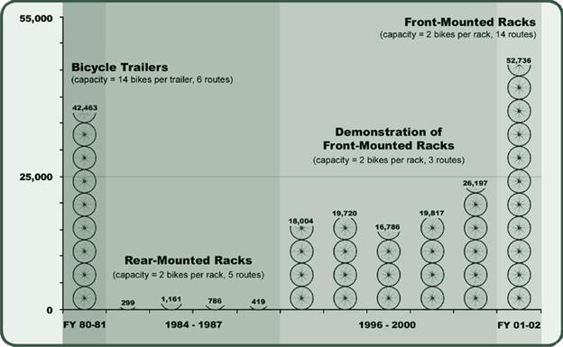 The chart below lists years and corresponding numbers of bicycles carried. Note that between 1984 and 1987 bicycle ridership was much lower than previous years, partly because of the difference in what the racks were capable of carrying — two bikes on the racks compared to 14 bikes on the trailers. Additionally, when the front-mounted racks initially were installed in the latter half of the 1990s, MTD ridership was much greater, reflecting a sharp rise in bike rack use. The fully implemented Bike & Bus Program beginning in February 2001 resulted in a sharp increase between fiscal years 2000–2001 and 2001–2002.