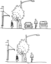 Costs may involve only restriping expense. More extensive work such as adding curb bulb-outs to enclose parking spaces and provide landscape space may increase the cost of parking treatments.