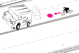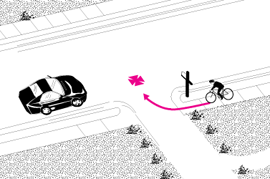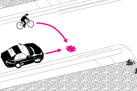 The bicyclist turns or merges right into the path of an oncoming motorist, or a bicyclist turns right across the path of a motorist traveling in the same direction as the bicyclist. This crash can also involve a bicyclist riding out from a sidewalk or shared-use path beside the road. The bicycle and the motor vehicle are initially on parallel paths.