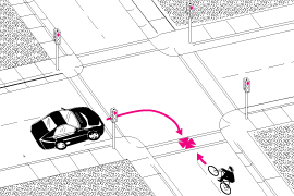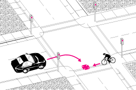 The bicyclist turns or merges left into the path of an overtaking motorist who is traveling straight ahead in the same direction as the bicyclist, or a bicyclist turning left strikes an oncoming motorist. This crash can also involve a bicyclist riding out from a sidewalk or path beside the road. The bicycle and the motor vehicle are initially on parallel paths.