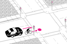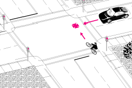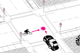 The bicyclist rides into the intersection through a red signal without stopping. The bicyclist may be trying to rush through on an amber signal indication, fail to see the red signal, or choose to disregard the signal. The bicyclist may not want to interrupt momentum or stop for a signal with an excessively long delay or that does not detect bicyclists’ presence. Inexperience could also contribute to this type of crash. The signal may be more difficult to observe if the bicyclist is traveling wrong-way or riding on the sidewalk.