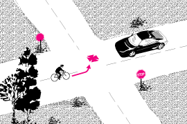 Bicyclist fails to yield at a stop sign, yield sign or uncontrolled intersection. Sidewalk or wrong-way riding may exacerbate the problem by increasing the chances the bicyclist will not notice and obey sign control. Younger bicyclists tend to be disproportionately involved in this crash type.