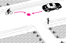 The motorist enters an intersection without properly stopping or yielding at a stop sign, yield sign, or uncontrolled location, striking a bicyclist who is traveling through the intersection on an initial perpendicular path. Many of these crashes also involve bicyclists who are riding the wrong way against traffic, either in the roadway or on the sidewalk approaching the intersection.