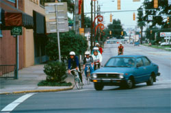 About half of the bicycle-motor vehicle crashes occur at or near intersections.1 While many of these crashes are not the fault of bicyclists, a frequent factor in these crashes is the bicyclist who ignores either traffic signals or stop signs at intersections. Bicyclist education is one remedy, but perhaps more important is law enforcement. Police often fail to respond to inappropriate maneuvers by bicyclists, and while it may be unrealistic to expect large increases in citations to bicyclists, wholesale increases in warnings could be effective.