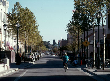 Lighting, street trees, on-street parking, bicycle parking, and buildings close to the roadway signal that this is an urban, low-speed, shared-use street. (Santa Cruz, CA)
