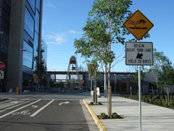 A bike lane at this intersection is marked to the left of right turning vehicles.