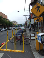On-street bicycle parking featuring inverted U type racks.