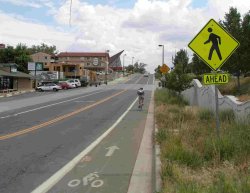 Broadway side path (top): Boulder designated this sidewalk along Broadway, an arterial that connects downtown to the CU campus, as a multiuse path. Markings and colored pavement separate bicycle and pedestrian travel flow. Where the path crosses Table Mesa Drive (bottom), the raised right turn by-pass crossing has improved compliance by motorists to yield the right of way and better facilitates eye contact between motorists and cyclists/pedestrians approaching the crosswalk. Note the signs warning motorists to expect bicycle/pedestrian traffic from both directions.